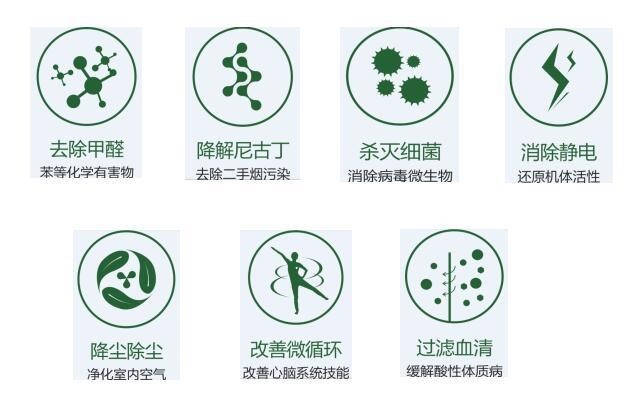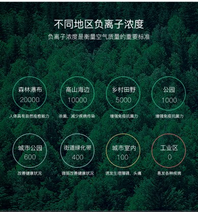 城市環境污染嚴重,負氧離子含量微乎其微,影響著人體健康,引發一系列健康問題與疾病。在空氣凈化領域,負離子的作用主要表現在負離子中的小離子可以捕捉漂浮微塵,使其凝聚而沉淀,從而使空氣凈化,當濃度達到20000個/cm3時,空氣中的飄塵會減少98%以上,飄塵直徑越小,越易被沉淀,所以在含有高濃度負氧離子的空氣中,直徑1μm以下的微塵、細菌、病毒等幾乎為零。負氧離子可迅速分解、祛除室內空氣中的甲醛、甲苯、VOC、二手煙塵等多項有害物質,有效沉降PM2.5。