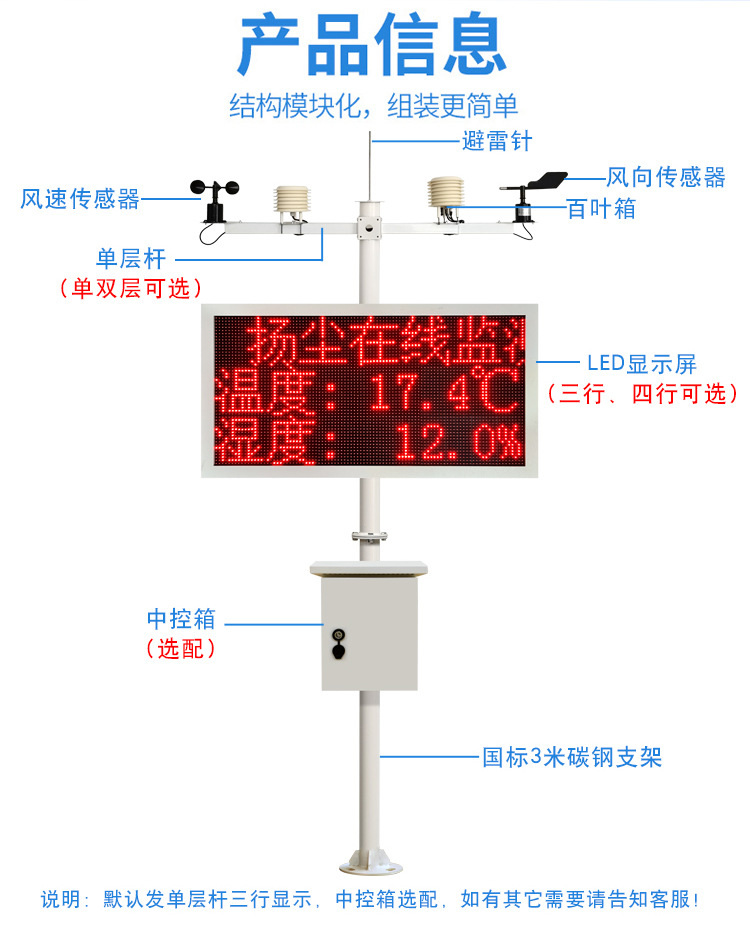 工地在線揚塵監測儀整體采用兩節式立桿式固定安裝,立桿可放置信號匯集柜,可固定戶外LED屏,方便室外任何環境安裝。